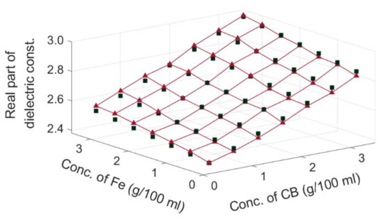 In this EMT model, the relative complex permittivities of carbon black and iron are respectively represented as follows: and . The density of carbon black is 1.8 g/cm3 [25,26,27]. The complex dielectric constant of the pure processing oil was approximately . All the measurements were performed at and .