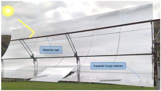 Parabolic trough collectors (PTCs) are among the various alternatives for the generation of solar thermal energy [28]. A PTC consists of a highly reflective panel constructed of silver-plated glass. The panel is shaped like a parabola and redirects the radiation of the sun into a concentrator made up of a pipe covered with borosilicate glass. The pipe contains low-viscosity oil with a high boiling point that absorbs the concentrated solar energy from the tube wall [29]. The oil concentrates solar radiation and heats up. This heat is subsequently transformed into electrical energy by a heat exchanger that generates steam to power a turbine. Subsequently, a cooling tower returns the water to the liquid state to restart the process again. To maximize sunlight harvesting efficiency, the pipe is placed along the focal line of the PTC and the position of the sun is tracked for normal incidence of solar radiations [30]. PTCs are a proven and reliable technology that presents a far more cost-efficient solution than other solar power technologies [31].