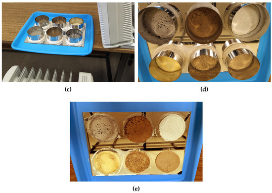 Figure 7a shows the cylinders placed on the reflector. These cylinders were glued to the reflector using elastic clay. The diluted pollutants were poured into the cylinders. The result is shown in Figure 7b. Figure 7c shows the drying process to achieve the evaporation of the water. In Figure 7d, it can be seen that the water evaporated and only the pollutant remained on the glass surface. Figure 7e shows the final result. This example shows the result of application of 5 g of pollutant per cylinder. As can be seen, the pollution of the reflector was achieved in a uniform way by applying a controlled amount of pollutant.