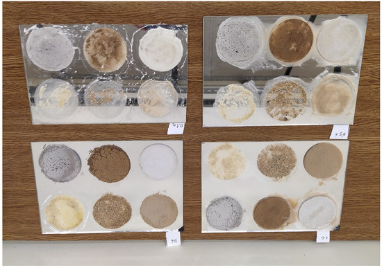 Figure 8 shows the final result after the application of the pollutants with the four considered densities. These are the reflectors that were used for the experiments. It can be seen how the pollutants with a smaller particle size covered the polluted area much better for the same quantity. This effect was more visible as the amount of pollutant was reduced. In these cases, the pollutant with large particles was concentrated in some areas, where the rest of the reflector was left similar to non-polluted areas.