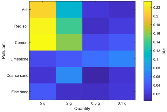 Figure 11 shows the differences in reflectivity differences between the polluted and clean areas of the reflector for each pollutant and quantity. In this color map, it can be clearly appreciated where the largest differences in reflectivity are found. The largest thermal contrast appears with the pollutants ash, red soil and cement. However, this difference decreases as the quantity of pollutant is reduced. For a concentration of 0.5 and 0.1 g the differences are similar to those of the rest of the pollutants.