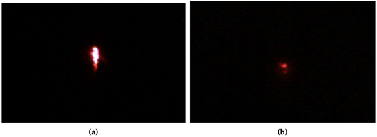 For the experiments, the exposure time is fixed on the camera sensor and an aperture is configured in the optics so that only high intensity light is observed in the image, that is, laser light. The images resulting from the reflection of the laser on a clean reflector and one polluted (0.1 g of fine sand) are shown in Figure 12. As can be seen, the reflected area in the clean reflector is larger and with more intensity than in the polluted reflector.