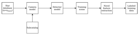 15], which is a star database made publicly available by the European Space Agency (ESA). A subsection of the star catalog is used and defined as the star database. Training data is generated by looping over the reference stars in this database. A scene consisting of an array of x, y coordinates of centroids is created using the camera and the detector model. This contains the reference star in the center. Relevant noise levels like the number of false stars per scene are also included.