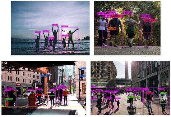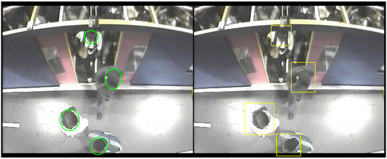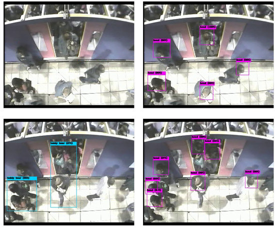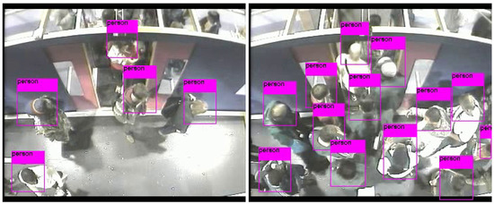 The detection performances of the three models are evaluated and compared on the 13,238 unseen examples more or less balanced between boarding and alighting examples. The results have been computed using the MOT (Multi Object Tracking) Challenge Development Kit [72]. Results are shown in Table 1 for expansion rates of 0%, 25%, and 50%. Bold figures indicate the best results in each row. The mean and standard deviations are computed over the seven testing sequences. F1 and, to a lesser extent, mean average precision mAP, are good indicators of detection capability. Note that in a real application, F1 is a better indication of performance as it indicates the possible balance between precision (and hence of false positives) and recall (indicative of false negatives), for a given detection confidence threshold. In the cases considered here, Yolov3 is likely to have a precision and recall performance of around 89.5% (when setting an operational point that balances precision and recall). It can be observed that Faster R-CNN and Yolov3 outperform EspinNetV2 in all tests by a margin of around 13–20% in F1. Yolov3 is fairly stable across the different expansion rates and outperforms Faster R-CNN in F1. Faster-RCNN and EspinetV2 show some improvement for a 50% expansion rate (the similar behavior is expected as EspinetV2 is derived from Faster-RCNN). Finally, it should also be noted that Yolov3 has inference (detection) times around five times faster than Faster-RCNN. Figure 7 shows a couple of examples of people detection.
