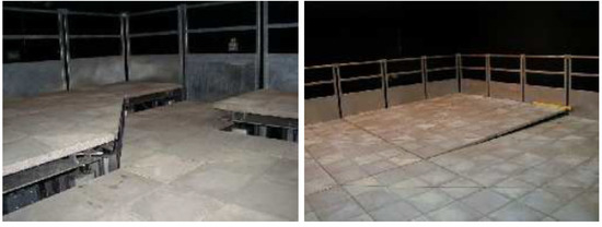 The Pedestrian Accessibility Movement Environment Laboratory (PAMELA) [69] is a multi-sensor facility at University College London (UCL) in the UK, designed for the assessment of pedestrian movement in many application domains (transport, health, architecture, etc.). An interesting characteristic of PAMELA is that it is possible to shape its environment (walls, walking surfaces, lighting, sound) to suit the experiments. The walking area consists of individual 1.2 m2 modules making up a total of 80 m2. Some examples are shown in Figure 4.
