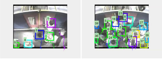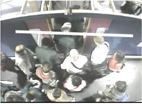 The evaluation of counting has been done on the videos known as “2008” in the dataset. These consist of 145 alighting sequences (most with 50 people alighting from the carriages) and 177 boarding sequences (most with 27–29 people boarding), under different conditions of crowdiness, depending on physical factors, such as door width. For alighting counts, the imaginary line is and for boarding . The overall results are summarized in Table 6.