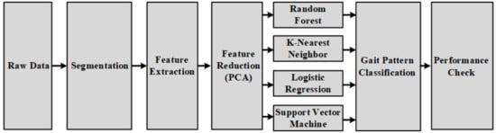 Figure 1 shows the overall experiment process of the gait classification. Raw data from the smart shoes sensors were segmented, and nine statistical feature extracting method were applied. To avoid the complexity of the model due to high dimension of multiple feature spaces, principal component analysis (PCA) was initialized for a feature reduction. Four machine learning algorithms were applied to classify gait patterns: random forest, k-nearest neighbor, logistic regression and support vector machine. In the end, their performances were evaluated in terms of accuracy, precision and recall, as explained in Section 2.8.