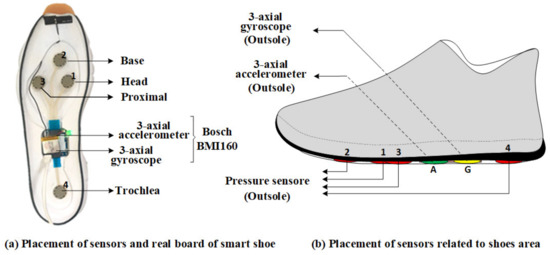 There were 18 healthy participants (18 men, age: 26.2 years; height: 176.2 cm; body mass: 73.1 kg) recruited for this study, and their average shoe size was 267.5 mm. Each participant wore shoes equipped with three types of sensors that were mounted in a particular position of the shoe, as can be seen in Figure 2. Four pressure sensors, a three-axis accelerometer and a three-axis gyroscope sensor were mounted on each shoe outsole. The pressure sensor produces one-channel data, while the accelerometer and gyroscope sensors each yield three-channel data. Therefore, a 20-channel dataset was acquired for one pair of shoes.