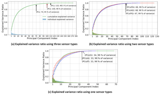 Figure 5a describes the explained variance ratio with respect to number of PCs using three different types of sensors, and thus the first 100 PCs are the optimal number of features. Figure 5b shows the explained variance ratio with respect to number of PCs using two different types of sensors. ‘PA’ denotes Pressure Sensors and Accelerometer, ‘AG’ denotes Accelerometer and Gyroscope and ‘PG’ denotes Pressure Sensors and Gyroscope. The optimal number of PCs is 69 for PA, 68 for PG and 67 for GA. Lastly, for individual sensor types P (Pressure Sensors), A (Accelerometer) and G (Gyroscope), the explained variance ratio with respect to number of PCs is shown in Figure 5c. With the same threshold value, the optimal number of PCs of P is 34, while for both A and G it is 33.
