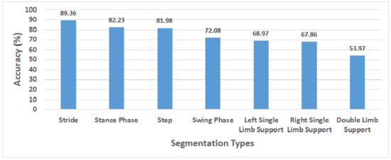 The selection of gait segmentation types has an important role to reach the best performance classification. In Figure 6, we sort the segmentation types based on the length of step during the participants walking from the longest to the shortest ones. The longer the step is, the more information it has. The results show the performance of gait classification using the stride reached the highest score (89.36%) followed by the stance phase (82.23%), step (81.98%), swing phase (72.08%), left single limb support (68.97%), right single limb support (67.86%) and double limb support (53.97%). The stance phase, slightly different from the step in the length of segmentation, shows the next highest performance and slightly higher performance than that of the step. Meanwhile, the swing phase, the left single limb support and the right single limb support reached performances lower than that of the step. The double limb support with the shortest segmentation length obtained the worst performance due to the least information.
