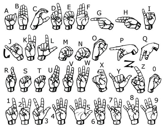 Specifically, a study by Ahmed et al. [2] revealed that American Sign Language (ASL) was the most frequently targeted sign language in linguistic research among all published papers from 2007 to 2017; that is, ASL was chosen as the principal sign language for research in most linguistic studies. Figure 1 shows the fingerspelling of ASL, which constitutes 36 gestures that represent 26 letters (A–Z) and 10 digits (0–9) with designated fingers and handshape gestures [3].