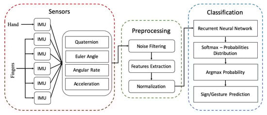 The proposed smart wearable ASL gesture recognition system is composed of three modules: (1) sensing, (2) preprocessing, and (3) classification, as illustrated in Figure 2.