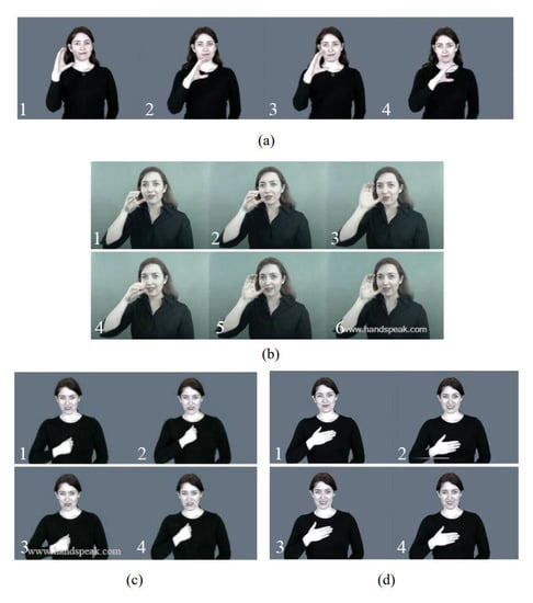 A series of images to illustrate the gestures that formed the ASL words (a) “search”, (b) “drink”, (c) “sorry”, and (d) “please” [27].