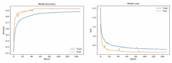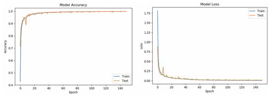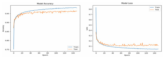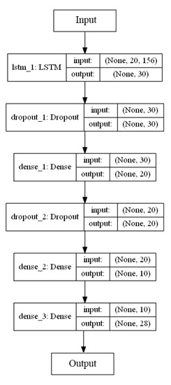 Table 5 shows the and of all classes (word-based ASL gestures) with promising results greater than 99%. The “drink” gesture has the lowest because there are some other gestures identified as “drink” gesture, similar to the cases of “pretty”, “happy”, and “thank you” gestures. Meanwhile, a “good” gesture is falsely identified (lower than 100%), similarly to the “understand”, “yes”, and “please” gestures. In short, the results indicate that the RNN5 has a nearly perfect true negative rate, better than the true positive rate which is slightly lower. The performance of the RNN5 from an overall perspective was evaluated with the accuracy rate (left) and loss function (right), trained with a total of 150 epochs and a batch size of 20. Initially, the LSTM layer, dense layers (excluding the last dense layer), and DR layers (DR value of 0) were configured, each with a number of output neurons ≥40, and the performance was plotted, as shown in Figure 7. Overfitting occurred after the 20th epoch, with the testing accuracy rate remaining at approximately 95% and error rate of 0.1, indicating that RNN5 was overtrained (too high complexity). For further improvement, the DR value was set at 0.1 (randomly removing 10% of the neurons in the RNN5), and the performance is depicted in Figure 8. Even though the gaps in accuracy rate and error rate between the training and testing reduced as the epochs increased, the gaps were still significant, indicating that the DR value was high and the removal of meaningful neurons caused the performance to drop. Thus, manipulation or tuning of the DR value and number of neurons, stressed by Sheela et al. [40], were applied to overcome the overfitting issue for better performance. After several trials, the best performance was achieved by RNN5 (see Figure 9) with the configuration of 30 output neurons in LSTM, 30 output neurons for the first DR layer (DR value of 0.02), 20 output neurons for the first dense layer, 20 output neurons for the second DR layer (DR value of 0.01), and 10 output neurons for the second dense layer, as illustrated in Figure 10.