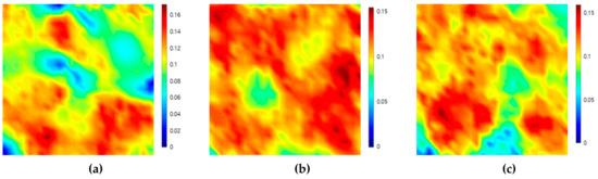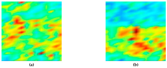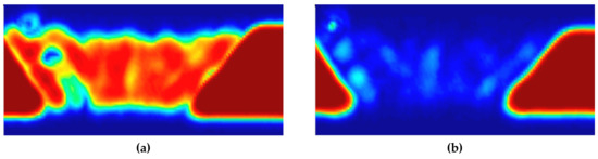 By the signals used to depict each of the images shown in Figure 4 and Figure 5, the attenuation map for the sample can be depicted by calculating the attenuation values for each position. Figure 6 shows the ultrasonic attenuation map depicted using the attenuation coefficients obtained from the first back-surface echo and the second back-surface echo by scanning the top, front, and side planes of the filler-metal sample. Through these images visualized using values calculated quantitatively using Equation (2), it can be seen that the color differences of each position shown in the images reflect the attenuation effect as the ultrasound wave reciprocates up and down twice within the filler-metal.