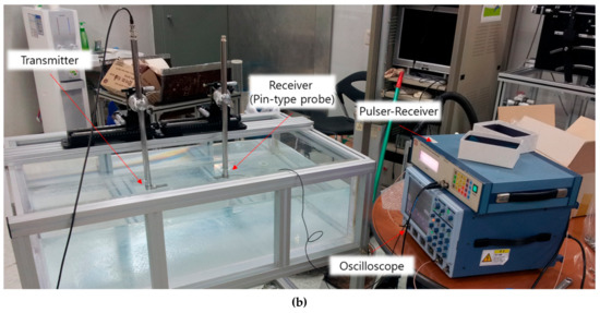 An experiment was also performed in which a through-transmission method was performed using a pin-type transducer. As shown in Figure 8, the same transducer used in the experiment with the pulse-echo method was used as the transmitter. Its position was fixed at a distance of 12.25 mm vertically from the center of the scan area. A transmitted ultrasound was passed through the test subject, and the signal was acquired by the pin-type transducer. The diameter of the pin-type transducer was 2.413 mm and its central frequency 5 MHz. The −6 dB fractional bandwidth was 78%. The location of the pin-type transducer was changed and scanned using the same area and step as in the experiment using the pulse-echo method. This experiment was also performed on three sides and at the same distance as in the experiment in which the pulse-echo method was applied.