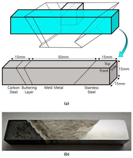 To analyze the propagation characteristics and beam splitting of ultrasonic waves in the DMWs, a cuboid specimen containing carbon steel, the buttering layer, filler metal, and stainless steel was fabricated. This specimen was fabricated to have the same central axis as that of the coupon sample. The bottom, width, and length of the base of the cuboid was 80 mm, 15 mm, and 15 mm, respectively. Figure 10 includes a schematic illustration showing the dimensions of the fabricated DMW specimen and a photograph of the DMW specimen.