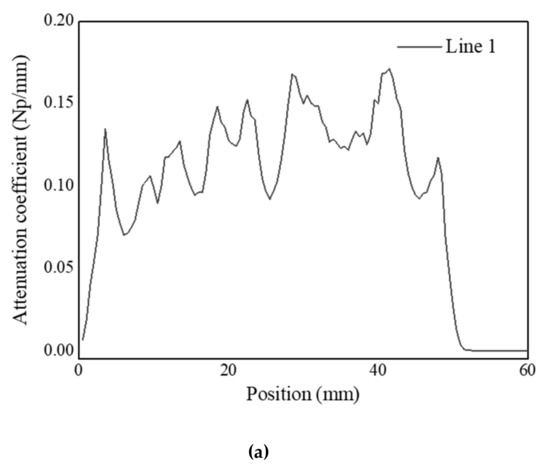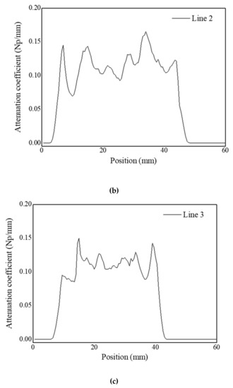 Attenuation coefficients calculated from ultrasonic signals obtained from (a) Line 1, (b) Line 2, and (c) Line 3.
