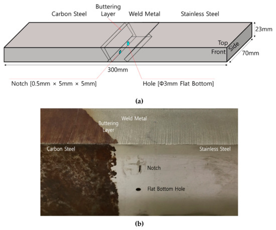In order to perform crack detection in DMWs, another DMW specimen was fabricated. To join stainless steel and carbon steel, a test piece was created by welding Inconel 182 [1] to carbon steel. The test piece was 300-mm-long, 70-mm-wide, and 23-mm-high. Primary water stress corrosion cracking is most likely to grow as the roots crack at the bottom of a weldment [25,26] so a flat bottom hole having a diameter of 5 mm and a notch of 0.5 mm × 5 mm × 5 mm were machined at the boundary between the weld-metal part and buttering layer of the specimen. This boundary is an area where PWSCC is formed and is vulnerable to growth. Figure 15 shows a DMW specimen with artificial defects.