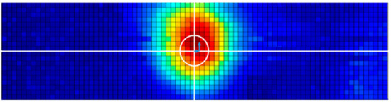 First, C-scan images of the flat bottom hole in the specimen were depicted by transmitting ultrasonic waves vertically. As shown in Figure 16, an area 30 mm × 10 mm around, the flat bottom hole was scanned while immersed using the pulse-echo method. The probe was a 6.35-mm-diameter circular plane transducer with a frequency of 5 MHz, as in the previous experiments.