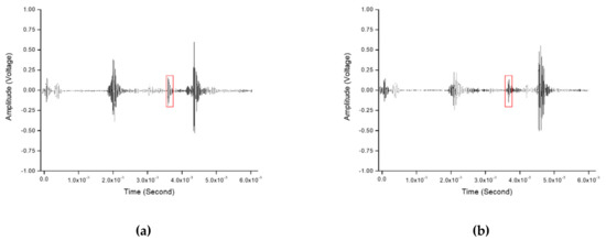 To verify the attenuation effect on each plane, attenuation coefficients were calculated for the locations with the largest signal amplitudes in the two sections where the first and second back echoes (respectively) were strong. Figure 7 shows the two positions selected for each plane, and Table 1 shows the attenuation coefficients for each plane, as calculated using Equation (2).