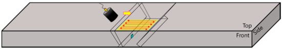 First, ultrasonic immersion testing was carried out, in which ultrasonic waves were vertically directed toward the top, front, and side planes using the ultrasonic pulse-echo method. The water distance was set to 12.25 mm, and a 6.35-mm diameter circular plane transducer with a 5-MHz frequency was used. The −6 dB fractional bandwidth was 85%. As shown in Figure 3, scanning was performed at 0.5-mm intervals over a 25-mm square area (wider than the specimen surface). C-scan images were depicted using signals obtained by the reflection of each plane while parallel to each of the three planes in the sequence, because the most suitable result for analyzing ultrasonic wave propagation can be obtained from the C-scan image.