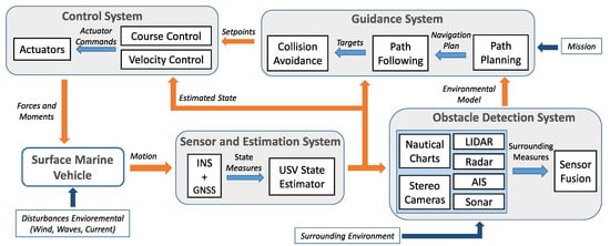 Nowadays, the application fields of unmanned surface vehicles (USVs) are very diverse [1], such as environmental control, scientific activities, commercial work, national security issues and surveillance. Consequently, the systems that provide the capacities required in order to consider a vessel as autonomous have become a very active field of research [1,2,3]. These systems, which are shown in Figure 1, must: estimate the vessel’s state vector [4,5], control its course and velocity through the actuators [4,5], process the sensor measurements to generate a model of the environment surrounding the USV [6,7,8,9,10,11] and carry out safe guidance of the vehicle towards its goal [3,4,5,7,9,12,13,14,15,16,17,18,19,20,21,22]. Therefore, the autonomy of a USV is determined by the level of development of the estimation, control, obstacle detection and guidance systems, and by their integration in a hardware platform [1,2,3]. More specifically, a USV’s guidance system is formed by three main subsystems: path planning, path following and obstacle avoidance (reactive algorithms). First, planning algorithms [3,7,18,23,24] generate collision-free paths with known obstacles that, in turn, lead the vehicle to its goal. Once a path is established, the path following algorithms change the course and velocity of the USV to follow it [4,5,19,25]. Finally, due to the presence of unknown obstacles for the path planner, reactive algorithms use the information provided by the obstacle detection system (generated from sensors’ measurements) to modify the course/velocity setpoints in order to avoid a collision [9,12,13,14,15,16,26,27,28,29,30]. Of the systems shown in Figure 1, this work is focused on the obstacle avoidance (OA) systems applied to the USV.