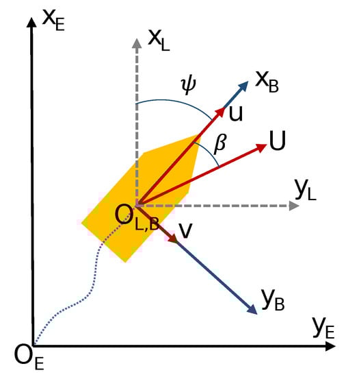 where represents the position vector of the USV referring to Earth-axes, and are the velocity and relative velocity vectors referring to body-axes, is the rotation matrix from body-axes to Earth-axes (see Figure 2) and are the forces and moment applied by the actuators.
