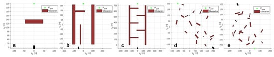 Obstacle scenarios used to evaluate the performances of SOA methods: (a) scenario 1, (b) scenario 2, (c) scenario 3, (d) scenario 4 and (e) scenario 5. Scenarios’ descriptions are available in [31].