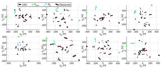 To carry out this study, a sample of scenarios () with a constant number of obstacles () was generated. These obstacles were randomly generated, as was the current direction, the initial position vector of the USV and the goal waypoint. In particular, the four points of the segments (6) were generated from a rectangle of random dimensions, position and orientation.