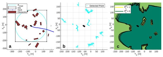 Since this work is not focused on the development of a obstacle detection system, in the numerical simulations OPG was calculated using the MATLAB Navigation Toolbox [63]. In particular, the occupancyMap function was used to define OPG according to its dimensions and resolution. This function is based on a Bayesian filter, an approach widely used to generate OPGs [8]. Once the grid is defined, in each sample time the measurements delivered by the LIDAR sensor (7) are translated to this grid. For this purpose, the insertRay function is used, whose inputs are directly compatible with the measured distances (8) and the position vector of the USV, . Furthermore, in order to avoid possible truncation errors caused by the discretization of the space, function inflate is used to expand each occupied cell a radius equivalent to . Finally, the function occupancyMatrix is used to obtain the probability of occupation of all the cells (); see Equation (15). As a result, Figure 5 shows: the USV navigating over an obstacle scenario, the LIDAR sensor measurements and the OPG.