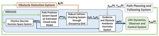 This system has been designed from the synthesis of several basic concepts in the field of OA methods [12,27,29,30,51], taking into account general criteria used in USVs [16,17,34,40] and new contributions in this field in order to increase the robustness and applicability of SOA methods to vessels. A general scheme of this new method is shown in Figure 6. As inputs, the algorithm requires the state vector of the USV (), an OPG () and goal setpoints (). As outputs, the RRSOAS generates the course and velocity setpoints for the USV controllers.