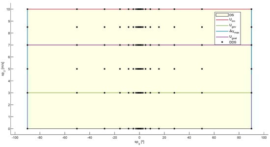 When sailing in the presence of obstacles, a vessel’s current velocity and course can lead to a collision. In order to avoid such possible collisions, it is necessary to study a set of alternative setpoints for the course and velocity of the USV [11,12,13,14,16,17,41]. The combination of these alternative setpoints defines the decision space at each sample time (k):