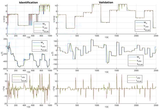 To implement the GA, Toolbox within Matlab was used [74]. In order to ensure the stability of the model and to limit the search space, the parameters of the vector were restricted while taking into account its physical meaning and the USV’s behavior. Consequently, the option mutationadaptfeasible was set as a mutation function [74] and the initial population was also limited. In addition, we allowed: a population of 200 individuals, a maximum of 100 generations and the parameter MaxStallGenerations was established as of the maximum of generations. Finally, to avoid early convergence [73,74], elite individuals were limited to of the population and the crossover factor was reduced (increasing the mutation factor) to . The other parameters were the ones established by default in [74]. As a result, the parameters identified for the ECLM, which estimates the dynamics of the closed-loop system formed by Equations (1), (3) and (5), were as follows: