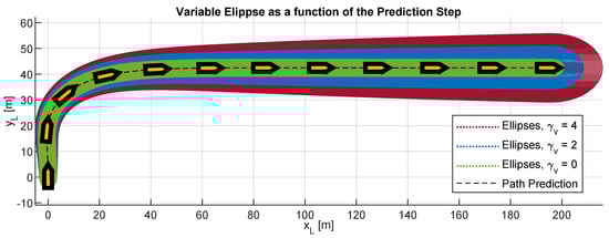 The path predictor proposed in this work uses a variable prediction horizon to ensure that all future paths cover the same prediction distance (). In this way, the prediction time is adapted to each pair of setpoints as a function of USV’s dynamics. In particular, we propose to set according to the measurement range of the sensors (). Furthermore, if this measurement range is oversized due to the maneuverability of the USV to avoid static obstacles, the distance can be reduced as long as it ensures that the course and speed of the ECLM (28) reaches the stationary regime.