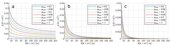 Since the set (16) is continuous, it can be discretized according to a resolution [13,14,16,17,26,27,30,40,41]. A disadvantage when a fixed resolution is used for the course setpoints and DS is centered on the current vehicle course, a standard approach followed in mobile robotics [12,26,27,30,51], is that the resolution must be increased to reduce the tracking error of the goal course [40]. Consequently, the calculation time increases with the number of alternative setpoints. An alternative approach is to center DS directly on the goal course [16,37]. In this way, the authors ensure that the guidance of the USV follows without the need to use high resolutions in the discretization of the course commands. Although, as a disadvantage, the symmetry (number of alternative setpoints to port and starboard) of space (16) depends on the angular distance between and . In order to reduce the tracking error with respect to without using high resolutions, while DS is centered around , we propose an exponential discretization for the course setpoints; see Equation (17). This discretization limits candidate courses to bring navigation more in line with COLREGS [68], carrying out minor corrections to compensate any course changes due to disturbances and applying significant course changes (easily perceived by other vessels [68]) if there is a risk of collision. Moreover, although the obstacles present in the environment force the RRSOAS to demand changes of course in only one direction, the symmetry of space (16) is not affected.