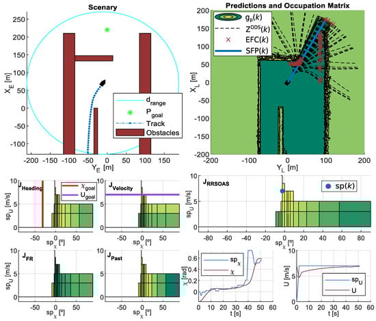 Finally, in line with most of the OA systems [11,12,13,14,16,17,26,27,30,33,40,41], it is necessary to define a goal course () at each simulation instant (k). In this paper the USV’s mission is to arrive at , so the goal course is defined by the Equation (13). If the mission involves following a concrete path, must be calculated according to the kind of path [4,5,19,25].