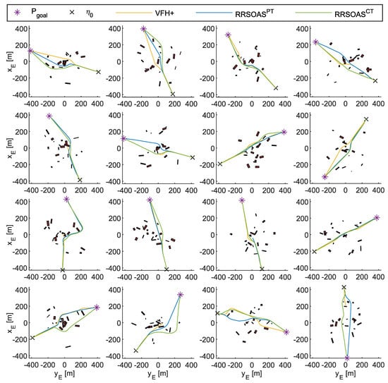 Finally, as a visual report, Figure 14 shows the paths followed by the USV in sixteen of the nine-hundred scenarios analyzed in this paper. In these scenarios the USV was guided by the VFH+ and RRSOAS algorithms, where the RRSOAS was tuned in two different ways: conservative tuning and performance tuning.
