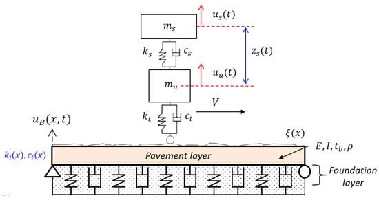To consider the deformable foundation, an Euler-Bernoulli beam resting on the viscoelastic foundation was investigated. Hardy and Cebon (1993) developed a quarter-car model on a smooth beam on a uniform Winkler foundation, to examine the vehicle–pavement–foundation interaction [20]. Similar approaches were adopted by other researchers and they used the models to understand the impact of vehicle parameters (including speed) on foundation responses [18,21]. Kelvin foundation under the Bernoulli beam was also adopted by authors in [22]. In their model, the interaction responses were examined by coupling the solutions of two systems—(1) vehicle on rough road and (2) elastic foundation subject to a single load. To eliminate the boundary condition effects, the frequency domain analysis of the interaction problem was performed on an infinite length beam [23]. Instead of handling infinite length, Kim et al. (2019) formulated the interaction system, based on a moving coordinate system, and examined the second-order stationary response of the interaction problem [24]. In the aforementioned studies, the foundation properties such as stiffness and density were assumed to be uniform, while in reality, those quantities might vary along the length of the road.