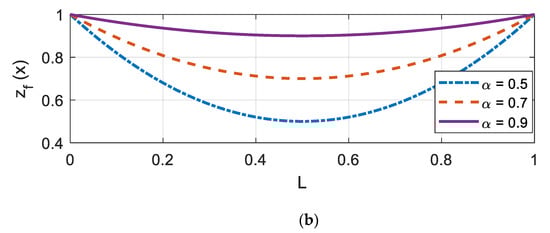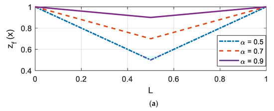 where the reference parameters for stiffness () and damping () are and N·s/m, respectively. The reduction factor was selected such that the soil had the most reduced value at the mid-span of the beam (L/2). In this study, was varied from 0.5, 0.7, and 0.9, which implied 50%, 70%, and 90% of the reference parameters. An illustration of for each is shown in Figure 2. Herein, the variation profiles are described with L and Q, for a linear and quadratic shape, respectively, followed by two digits describing α. For example, a dashed-dot plot in Figure 2a (linear with = 0.5) was denoted as ‘L50’. Similarly, ‘Q90’ indicates that varies in a quadratic manner (see a solid line in Figure 2b).