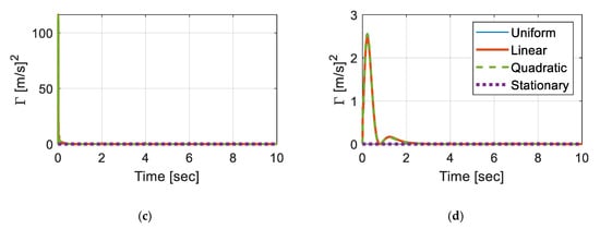 Covariance response of the vehicle over time (a) ; (b) ; (c) ; and (d) .