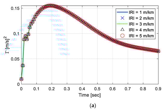where is the spatial circular frequency (); , is the waviness that is taken as 2.45, to match the average roads in the U.S. [42]. Note that is varied to match the International Roughness Index (IRIs), which is a measure of road roughness on ride comfort [43]. A lower IRI value indicates a smooth pavement, while a higher IRI implies a rough pavement. In this study, IRIs are varied from 1 to 5, and the corresponding ’s are approximated at those integers, using the golden car approach described in [35].