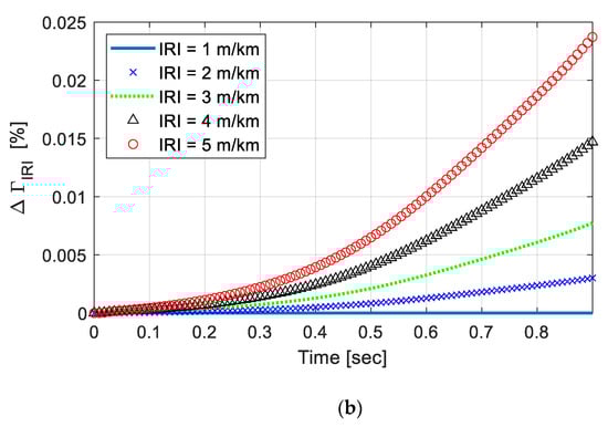 Furthermore, the responses were examined on various road roughness. To compare the results efficiently, Figure 4a plots with linearly varying foundation, as the IRIs varied from 1 to 5 m/km. A time-step integration method, ode45 was used as the vehicle crossed over the length with vehicle speed (V = 20 km/h). As could be seen, the effect of surface roughness on the nonstationary covariance responses were negligible. To better visualize the difference in the responses, the differences were plotted in Figure 4b, in percentage. The difference was estimated for each IRI (), with respect to the response at IRI = 1 km/m (), as below: