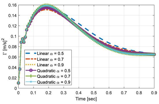 Figure 5 shows the time-varying covariance responses, , as the vehicle runs over the pavement with different types of foundation properties. The simulations were carried out on the basis of combinations of two variables—(1) foundation profile, implying how the subgrade properties change, i.e., either in a linear or in a quadratic manner, and (2) , which varied from 0.5, 0.7, to 0.9. Then, the variable time-step was used for the integration and then downsampled to present 100 data points within the duration. After the resampling procedure, one could consider that the responses on the vehicle were measured at about 110 Hz. The chosen sampling rate was low enough to be easily realized, yet could capture the key features of the responses. The response shown in Figure 5 are deterministic, as the foundation variation profiles, α, and the speed of the vehicle are known. However, deterministic identification based on Figure 5 was unrealistic, because the measured signals tended to be contaminated with noises.