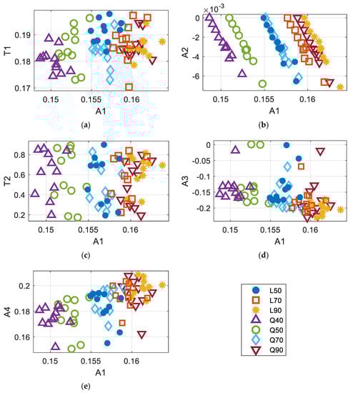 Based on the previously presented results, the following six features were selected—(1) maximum amplitude, A1; (2) time corresponding to A1, T1; (3) minimum tangent occurring between 0.2 s and 0.8 s, A2; (4) time corresponding to A2, T2; (5) slope of the linear regression between 0.2 s and 0.8 s, A3; and (6) y-intercept of the regression found in (5), A4. Then, to incorporate the measured noise in covariance responses, RMS noises were added in . The extracted features showed some relationships among them. Figure 7 illustrates the distribution of features over the range of A1. As can be seen, some features, such as A2 and A4, show a higher correlation with A1, while other features are more scattered over the range of A1. In addition, L70, L90, and Q90 seem to overlap with each other (as in Figure 7a–e, making it hard to differentiate with classification models that are based on decision trees, etc.
