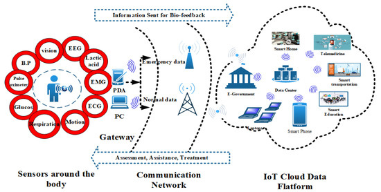 The Internet of Things (IoT) and WBAN have an integrated future [1,2]. The IoT is one of the most modern promising research areas and is becoming a common platform where smart objects stay connected to the Internet for transmitting and receiving smart data [3,4,5]. The world is embracing the adoption of 5G while the 6G protocol [6,7,8], which is the next generation of advancement in wireless technology, is around the corner that will be a much great enhancer of IoT-based technologies. The IoT continues to grow as more and more devices are connected to it. General estimates reveal that the number of smart IoT devices will approach over 50 billion by 2022. The IoT landscape is evolving ever rapidly than before and is impacting the global economy. The Gartner Report sees its advantages in terms of economic impacts in 2022 to be around 2 trillion USD [9].