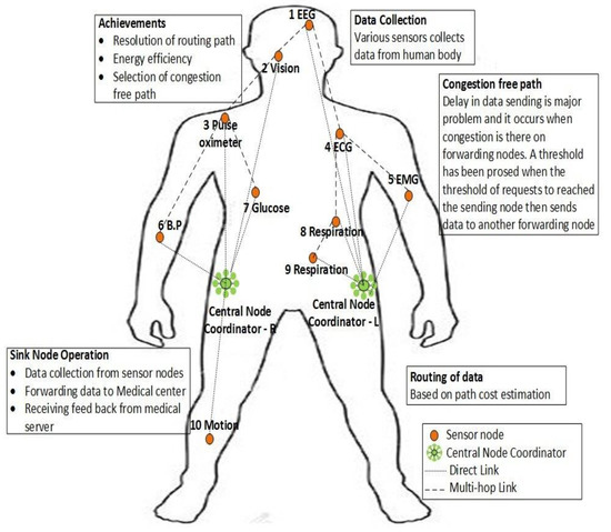The topology used for proposed WBAN scheme has a total of ten SNs and two sink nodes, called the central node coordinator (CNC). These nodes are placed on various parts of the human body, as shown with details in Figure 3. These deployed tiny sensors sense human-related medical data such as glucose, BP, EMG, ECG and other important medical parameters. These sensed data are then forwarded to the CNC for further required processing. Details of the simulation are given below in Table 3.