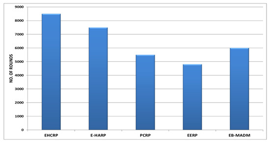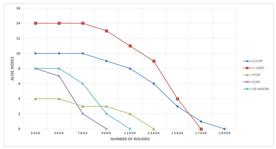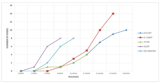 This is defined as the total period of time till death of first node of a network or while all sensors are active and alive. This parameter is also considered important in the efficiency of any type of WSN network including WBANs. The proposed scheme worked well in this regard compared to other protocols. The results shown in Figure 7 and Figure 8 are evidence of this. Figure 7 and Table 5 show that the first node of EHCRP protocol died at the 8500th round, which is much higher than the 7500th round of E-HARP, 5500th round of PCRP, 4800th round of EERP and 6000th round of EB-MADM, respectively. It is clear from Figure 7 that the proposed system delays the death of the first node, which means it performed better than others. The high network stability of the proposed algorithm is due to the smart harvesting energy units in each node and the elimination of extra processing overload due to duplicate data transmission.