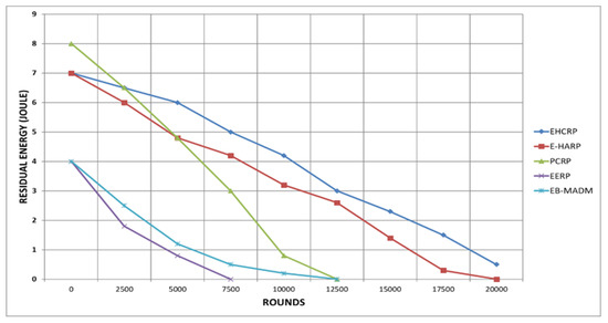 Residual energy is defined as the remaining energy of any SN in the deployed sensor network. The energy of the SNs is consumed by different operation such as sensing data, storing it, receiving and forwarding, processing etc. The energy consumption is burning parameters for any network having battery operated devices such as in WBANs. This presented scheme shown good performance in terms of energy usages which is portrayed in Figure 9 and in Table 6. EHCRP is leading this branch compared with other schemes. The energy depletion process of EHCRP and E-HARP during simulation was almost equal in ratio. The proposed protocol energy lasted almost till 20000th round. The energy of EERP depleted very quickly and it completely drained before 7500th round, which shows bad performance. Also, PCRP didn’t execute well with respect to residual energy depletion as its energy lasted only to 10000th round. The main reason behind the better performance of EHRCP in terms of less energy consumption is its optimized working mechanism.