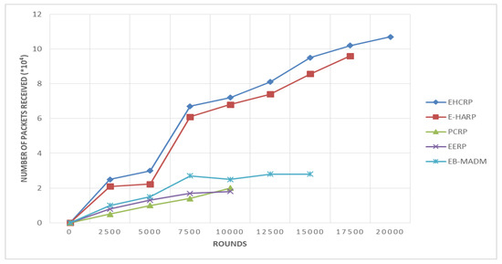 It is fruitful to transmit data from SN to the SN or sink/coordinator node in a given time. More throughputs per unit time are considered a good feature for any kind of WSN, especially WBANs. It is the successful delivery of packets in data transmission. Throughput is one of the most important parameters while judging any scheme or protocol for data transmission. High throughput means better performance. The results in Table 7 and Figure 10 show the success of EHCRP in this aspect. At the initial stage of the throughput simulation, the fluctuations among the compared protocols were minimum but after the 7500th round, it increased with a distinct margin. The reason is that at round 7500 the throughput of EHCRP becomes more than double (6.7) compared to the 5000th round, which was 3. Overall the proposed protocol achieved 10.7 × 104 in 20,000 s, whereas its counterparts, did not exceeded 4.7 × 104, except for E-HARP which was the closest and achieved 9.6 × 104 throughput. The main reason behind the better performance of EHCRP in terms of throughput is that it considers different parameters of the communication link before the transmission, such as SNR, link quality, etc. This ultimately avoids the loss of data packets during transmission.
